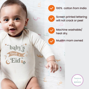 • Your baby’s first Eid is a special occasion, celebrate it with this bodysuit, a perfect gift for the precious little one in your life. Created this design in 2016 when I had my own daughter and wanted to remember her first Eid. Our soft cotton bodysuit is as comfy as it is cute, and will elevate your little ones look.