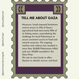 Your purchase is helping us positively impact the lives of those affected by the ongoing assault and ensuing catastrophic humanitarian crisis. Jasmine + Marigold stands in solidarity with the people of Gaza and Palestine.