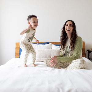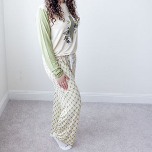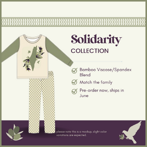 • Olive branches of hope. Our latest collaboration with Visuals by Noor features an olive colored keffiyeh print on a cream bamboo viscose pajama pant, and a pajama shirt featuring a historical Palestine map, adorned by olive branches and ascending doves.