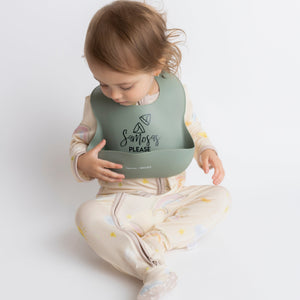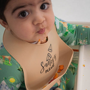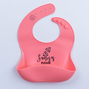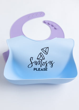 • Introducing the "Samosas Please" bib! Cute and practical, this bib will make your baby's experience in the kitchen easier.