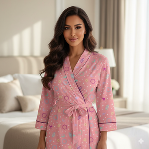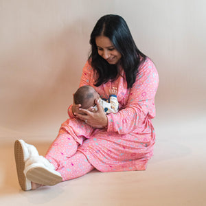 Pretty in pink in Jasmine + Marigold’s geometric tesselation robe.  Our new collection features the phases of the moon, lanterns, and stars to truly have a starry night. This gorgeous pink robe is Ideal for lounging or layering over our PJs, the Luxe Bamboo Robe is composed of buttery-soft bamboo viscose that is the perfect blend of comfort and luxury.  Match with our ruffle romper or pajama sets.