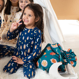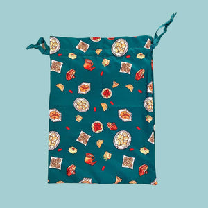 • As a mom who loves pretty things, I admit that I do love one-time-use gift wrap but I am hoping to be less focused on waste and more focused on using reusable gift bags. Meet Jasmine + Marigold’s year-round gift bags. Our sturdy bags can hold your child’s Eid gifts -- since they purposely don’t mention Eid or Ramadan (the listing images show Happy Ramadan - but we changed it for the final), they can be used year-round. This colorful bag features food from all cultures: honey, dates, patties, samosas, and so much more! There is a satin drawstring ribbon.