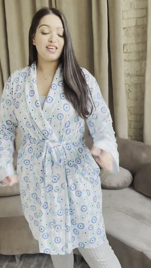 Wrap up in comfort with our evil eye print bamboo kimono robe. Designed to perfectly coordinate with our children’s evil eye pajamas, but also a beautiful piece to elevate your everyday. Tailored fit yet also drapes effortlessly. Ideal for lounging or layering over our evil eye joggers, the Luxe Bamboo Robe is composed of buttery-soft bamboo viscose that is the perfect blend of comfort and luxury. Our robe features an adjustable internal waist tie and external belt, and 2 side seam pockets.